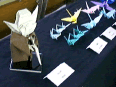 会では7時過ぎから、(本紙特派員でもある)前川淳の司会・出題によるクイズ大会が行われた。「千羽鶴折形(おりがたではない)と同年に生まれたひとは?」(答えはシューベルト)などの予選問題(択一式)を勝ち抜き、決勝戦に残ったのは、岡村、木下(剛)、宮島、渡部、新本、加藤、川上の7氏であった。決勝戦では、高校1年生の木下君が、第1問を誤答したものの、若さ溢れる追い込みを見せ、みごと豪華優勝カップと副賞を手にした。岡村氏、宮島氏も頑張ったが及ばなかった。「若くして栄光をつかむと、教育上良くない」という、教育者らしい、あるいは、自分のチャンピオン予想がはずれて景品を取り損ねた難癖のような川崎敏和氏の意見もあったが、「折紙探偵団・懇親会クイズ王」は何の権威もない賞なので、心配はないだろう。木下君は、今後も「便器」や「ダイオウイカとマッコウクジラの戦い」のような、妙な作品をつくり続けていって欲しい。